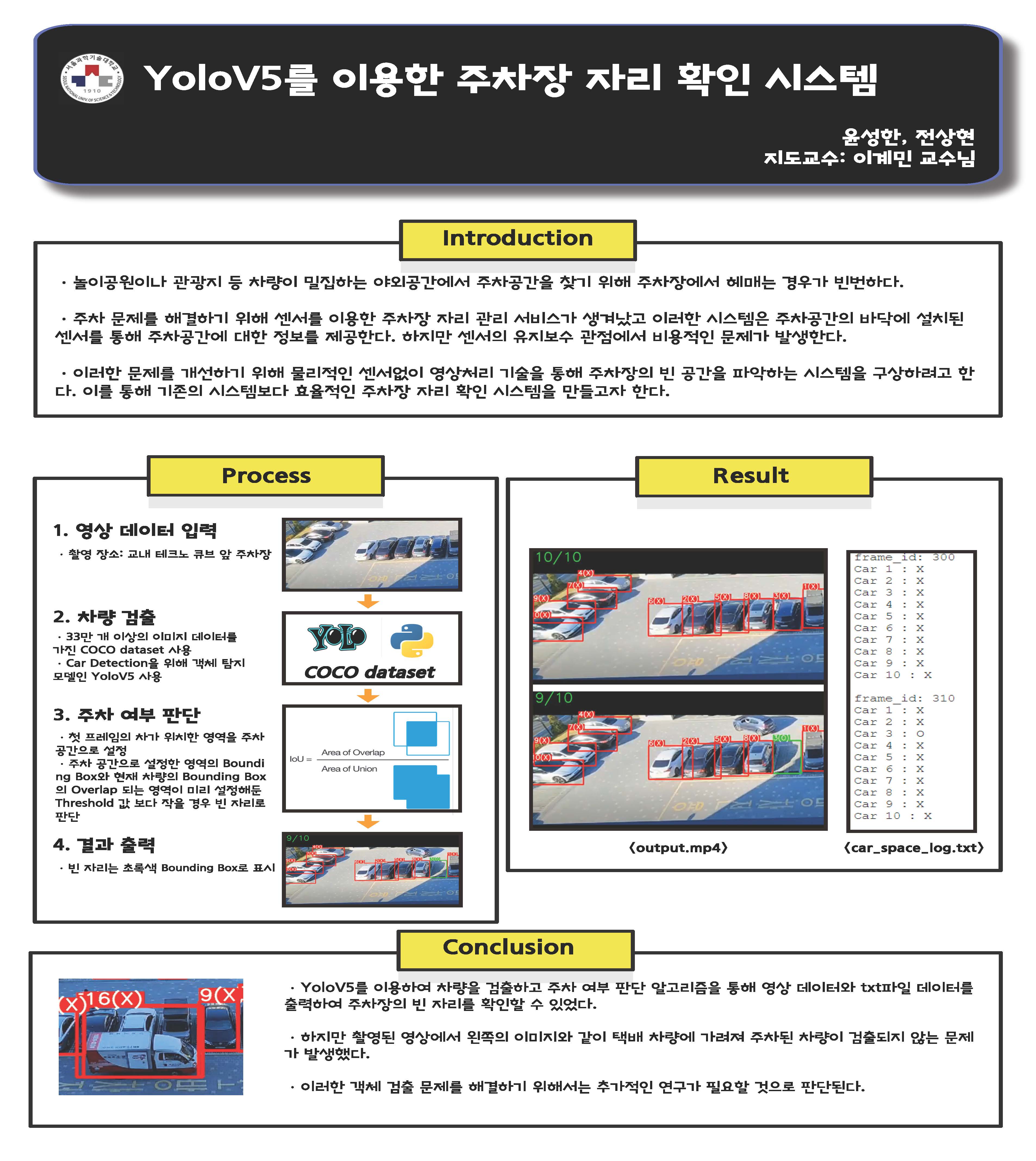 | 제목 | YoloV5를 이용한 주차장 자리 확인 시스템 | 날짜 | 2022-11-18 | 조회수 | 546 |